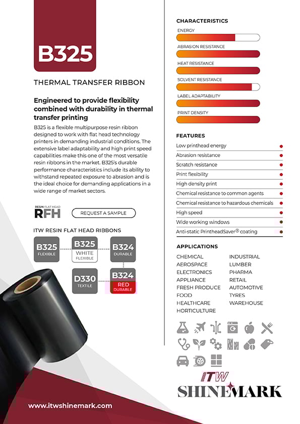 B325 is a flexible multipurpose resin ribbon designed to work with flat head technology printers in demanding industrial conditions. The extensive label adaptability and high print speed capabilities make this one of the most versatile resin ribbons in the market. B325’s durable performance characteristics include its ability to withstand repeated exposure to abrasion and is the ideal choice for demanding applications in a wide range of market sectors.